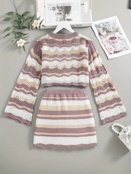 Tween Girl Knitted Gradient Striped Hollow Out Sweater + Knit Skirt 2-Piece Set For Spring And Autumn Casual Outdoor Activities