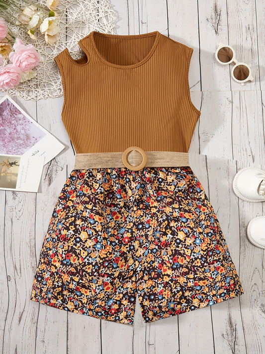 Teen Girls 2PCS Cut-out Shoulder Sleeveless Top + Retro Floral Shorts Set, 2-piece Casual Summer Outfit, For Outdoor Casual Activities