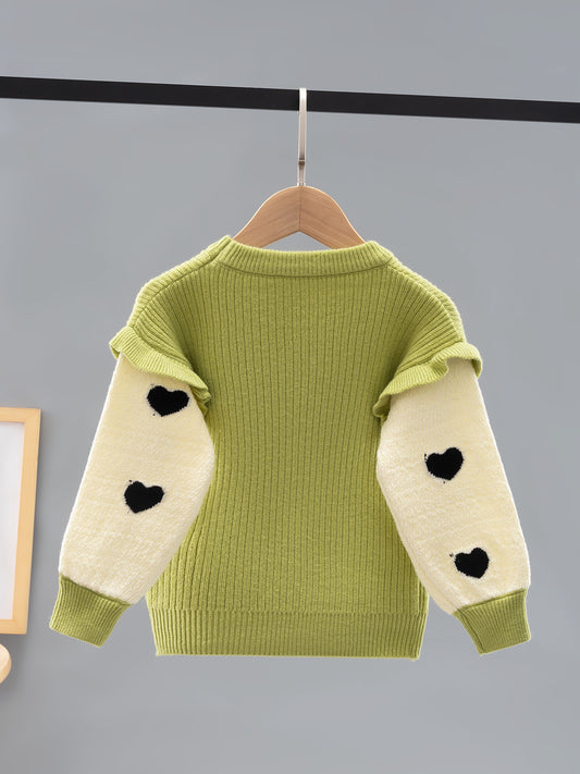 Sweet Contrast-knit Girls Set, Cozy Crew Neck Knit Sweater & Wide Leg Sweater Pants Set - Heart Dots Pattern, Autumn/Winter Clothes