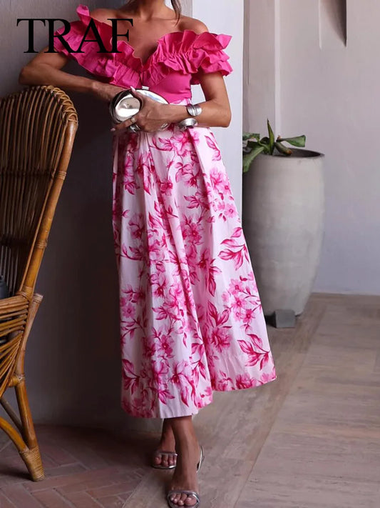 TRAF 2024 Woman Pink Floral Printed Casual Loose Skirt Women Chic A Line High Waist Long Skirt Y2K Streetwear For Beach Holiday