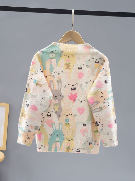 Sweet Bunnies Allover Knit Cardigan Sweater For Girls, Cozy Warm Long Sleeve Crew Neck Knitted Coat For Winter/ Fall