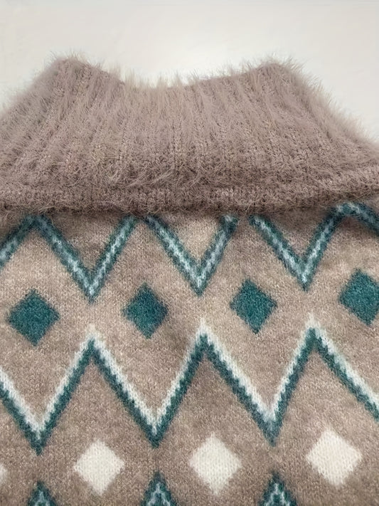 Thermal Stylish Argyle Knitted Sweater For Girls, Soft Fluffy Long Sleeve Mock Neck Jumper Top