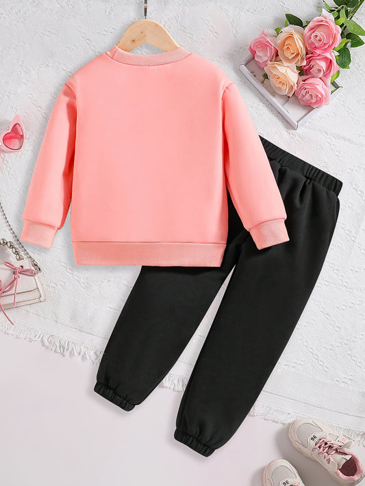 Tween Girls Cartoon Pattern Printed Warm Plus Velvet Thick Round Neck Sweater + Sports Pants Fashion Two-Piece Set, For Outdoor