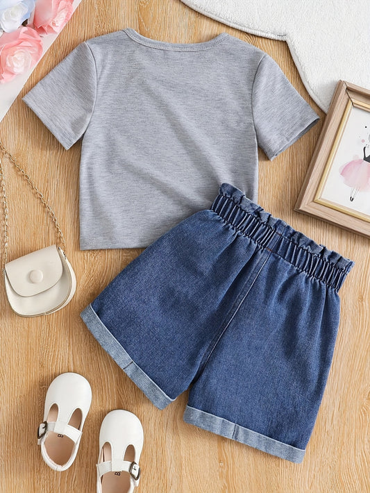 Sweet Girls Cartoon Doll Graphic Print Short Sleeve Tee & Denim Shorts