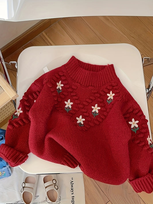 Thick Sweet Flowers Pattern Knit Comfy Crew Neck Long Sleeve Sweater For Girls Winter/ Fall Clothing