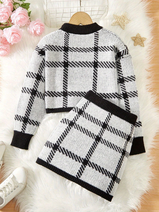 2pcs Girls’ Plaid Knit Sweater & Skirt Set – Cozy Fall/Winter Casual Outfit