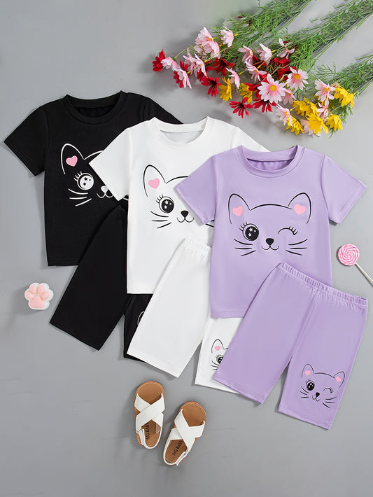 3 Sets Girls’ Cartoon Cat Print Summer Outfit – Solid Color Round Neck T-Shirts & Shorts