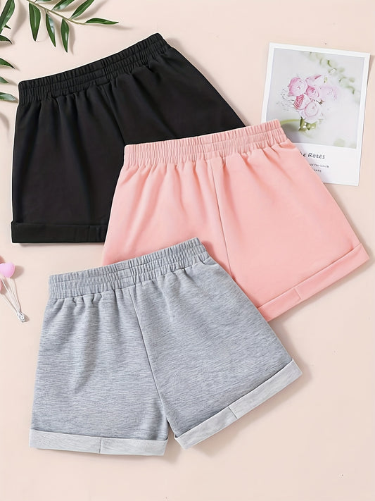 3pcs Girls’ French Terry Casual Shorts – Breathable, Regular Fit for Sports & Outdoor Activities