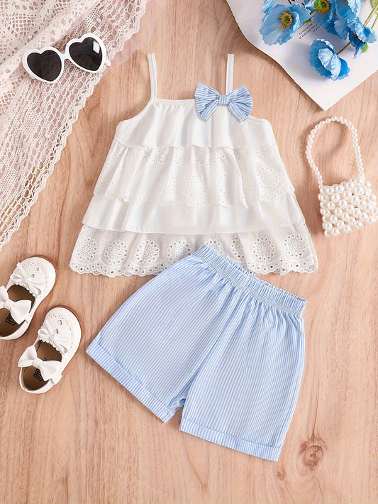 2pcs Girls’ Lace Camisole & Striped Shorts – Summer Outdoor Outfit