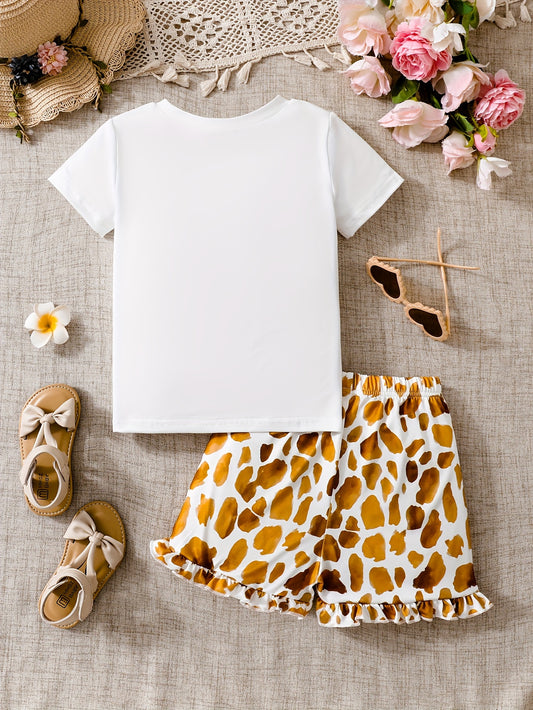 2pcs Girls’ Cartoon Giraffe Print Outfit – T-Shirt Pullover & Shorts Set