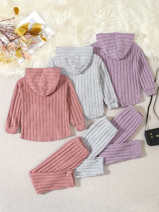 3pcs Girls' Vintage Hooded Sweatshirt & Pants Set – Casual Knit Pullover with Patched Details