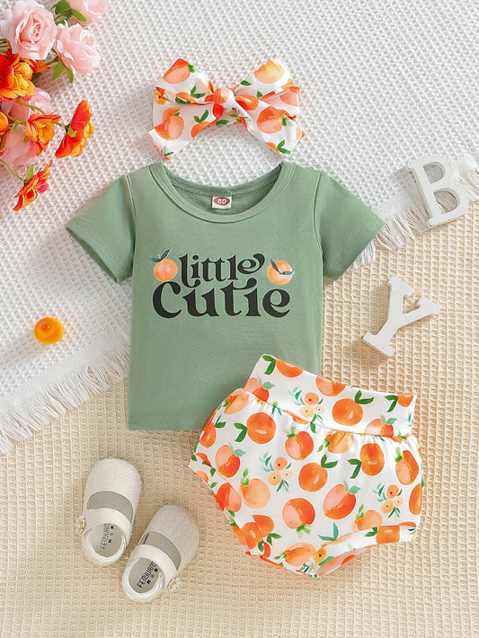 2pcs Infant & Toddler's LITTLE CUTIE Print Casual Set, T-shirt & Peach All-over Print Shorts, Baby Girl's Clothes
