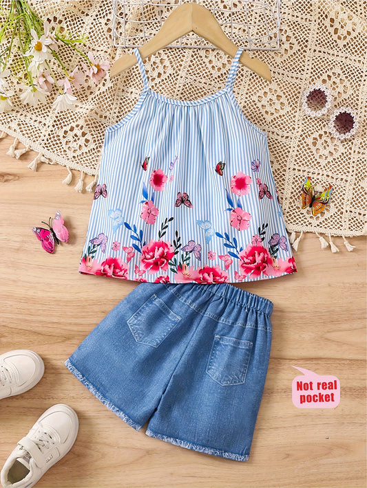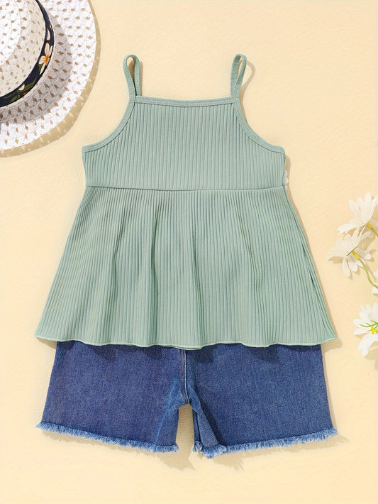 2pcs Toddler Girl’s Ruffle Flower Cami & Denim Shorts – Summer Outfit