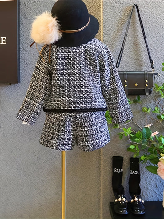 2pcs Girls’ Elegant Tweed Outfit – Floral Decor Jacket & Shorts Set