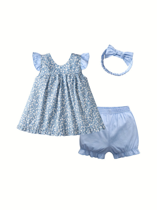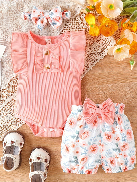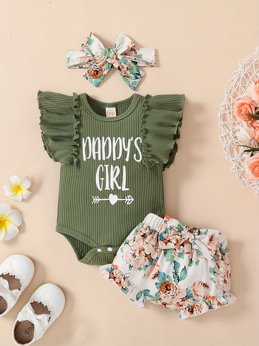 3pcs Baby Girls’ "Daddy's Girl" Ruffle Sleeve Onesie, Floral Shorts & Headband – Summer Outdoor Set