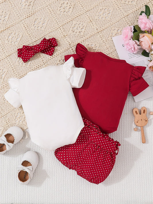 3pcs Infant Bunny Embroidered Summer Set – Short Sleeve Onesie & Polka Dot Shorts for Baby Girls