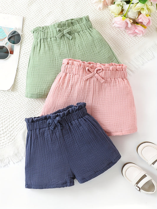 3pcs Girls’ Muslin Bow Decor Shorts – Soft, Breathable, 100% Cotton Summer Outfit