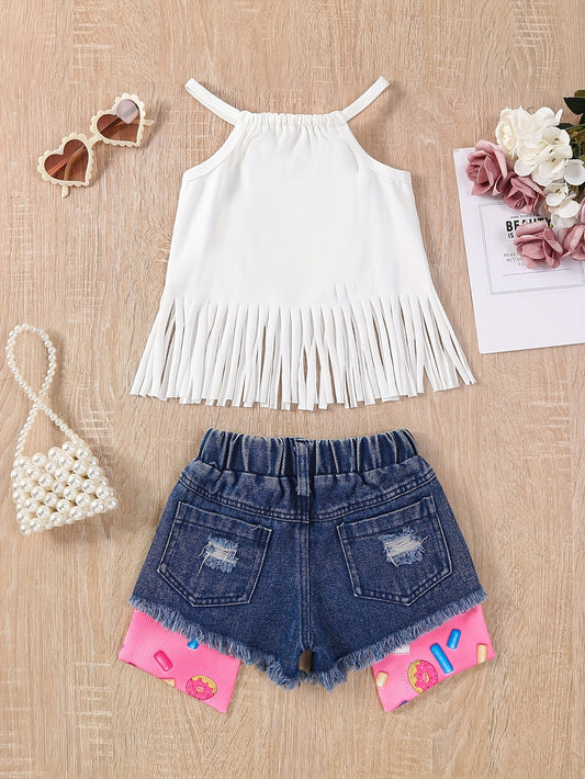 2pcs Girls’ Donut Graphic Summer Outfit – Tassel Hem Cami Top & Ripped Denim Shorts