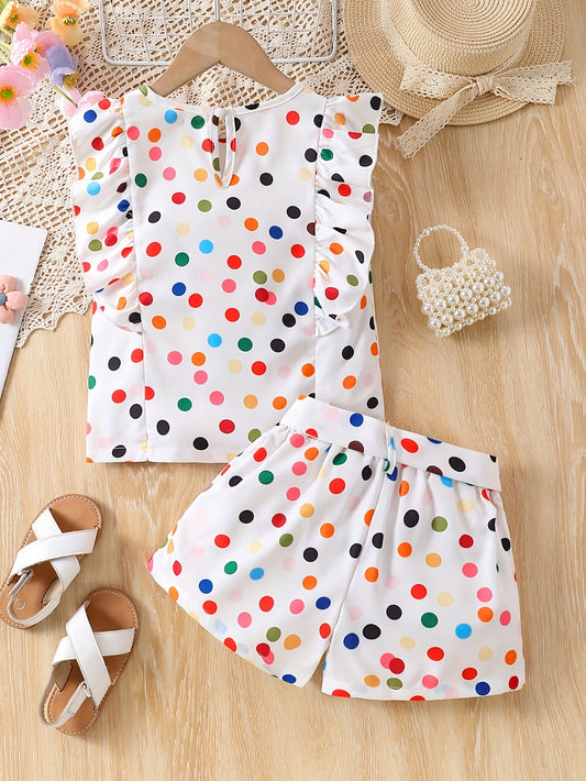 2pcs Dreamy Polka Dot Print Sleeveless Top + Shorts Set with Ruffle Trim and Bow Belt for Girls Summer Outfits
