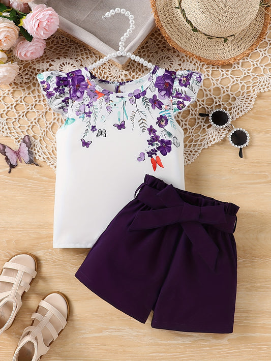 2pcs Girls’ Nature Flowers Graphic Outfit – Frill Sleeve Top & Solid Shorts Casual Set
