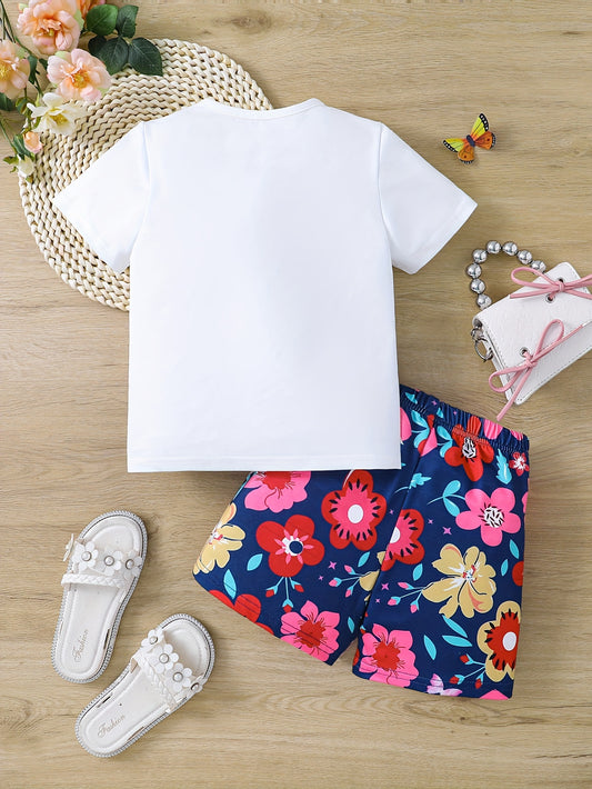 2pcs Girls Short Sleeve Giraffe And Flower Print T-shirt & Floral Shorts