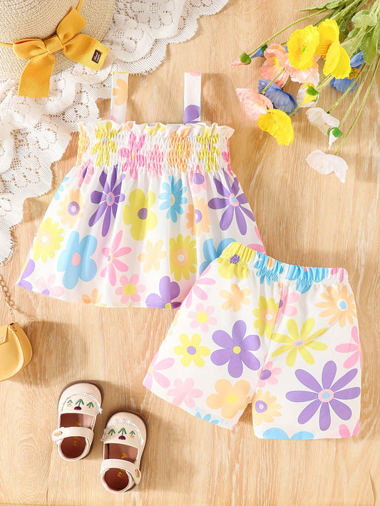 2pcs Toddler Girl’s Flower Pattern Cami Top & Shorts Set – Summer Beach Vacation Outfit