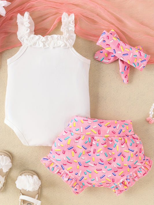 2pcs Toddler & Infant Girl's "Sweet One" Donut Print Ruffled Bodysuit, Triangle Shorts & Hairband Set for Summer Party