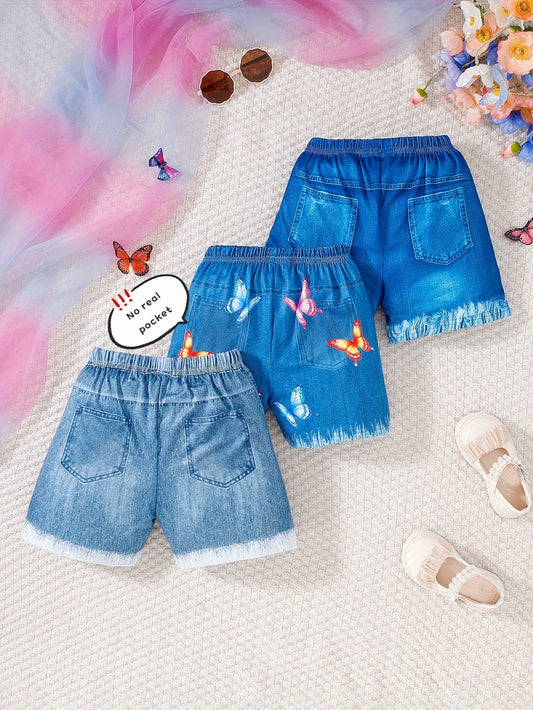 3pcs Girls’ Cartoon & Butterflies Print Shorts – Color Block Design, Regular Fit, Machine Washable