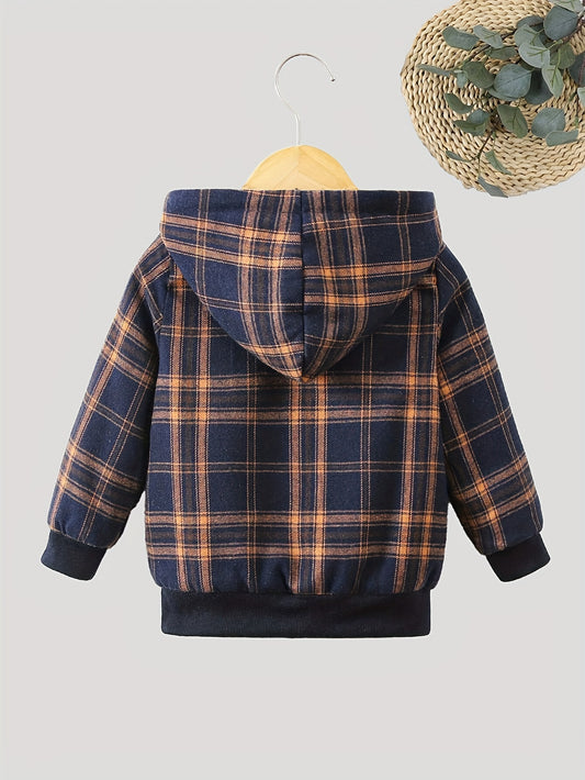 Boys Winter Plaid Fleece-lined Warm Hooded Jacket With Zipper