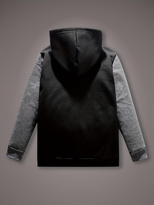 Boys Thick Fleece Lining Jacket, Warm Zip Up Hooded Coat, Casual Color Clash Zipper Hoodie