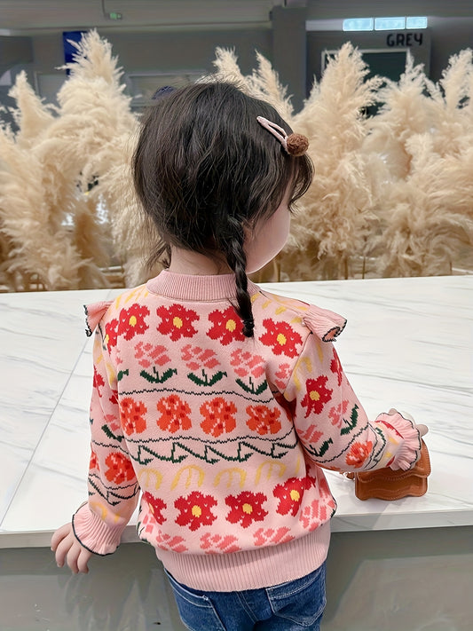 Cute Floral Crew Neck Pullover Sweater for Children - Polyester & Elastane Blend, Long Sleeve, Medium Stretch Knit Fabric