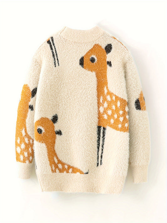 Cozy Deer Pattern Girl's Christmas Sweater - Pullover - Soft Imitating Mink Fleece, Long Sleeve, Round Neck