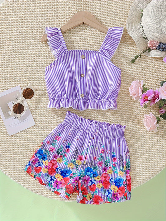 Cute Striped Suspender Top + Flower Striped Shorts 2-Piece Girl's Set, Girls Summer Outdoor Clothes, Holiday Gift Casual Wear