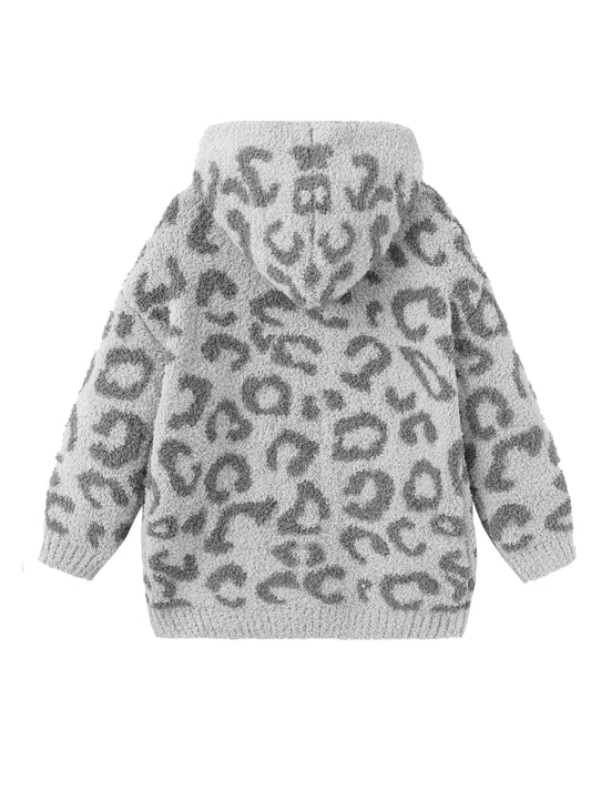 Cozy Leopard Print Hooded Cardigan - Soft Long Sleeve Open Front Knitwear for Girls