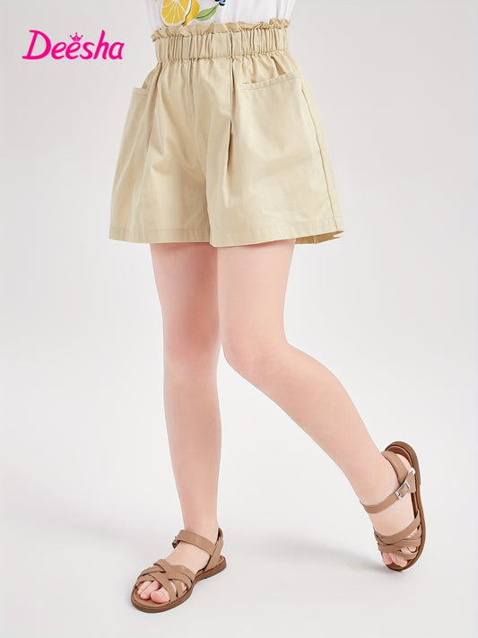 Comfy Solid Color Cotton Bow Back Shorts for Girls - Loose Fit, Non-Stretch Fabric, Practical Pockets, Perfect for Summer Wear - Breathable, Woven, and Soft