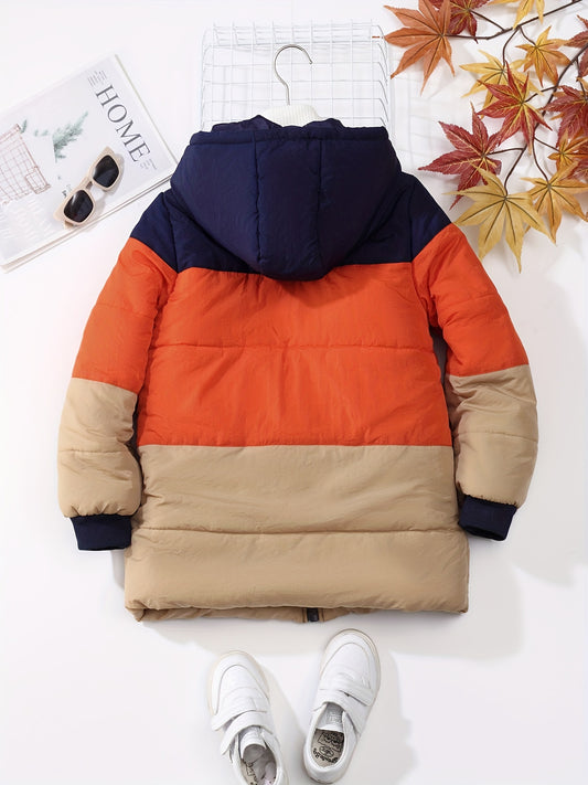 Color Block Zip Hooded Coat - Lightweight, Padded, Warm, and Water-Resistant Winter Outerwear for Boys and Girls