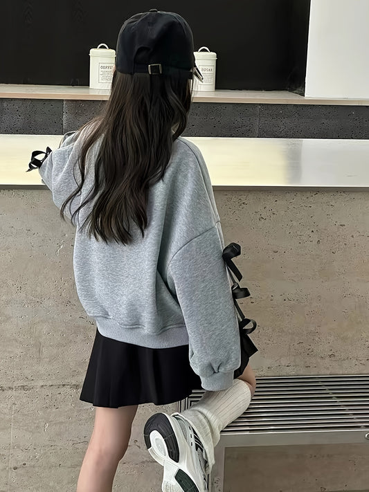 Cozy Fleece-Lined Girls' Sweatshirt with Bow Detail - Casual Crew Neck Pullover, Soft Cotton Blend
