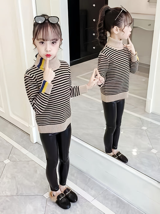 Cozy Girls' Long Sleeve Striped Knit Turtleneck Sweater for Autumn and Winter - Warm Layering Top