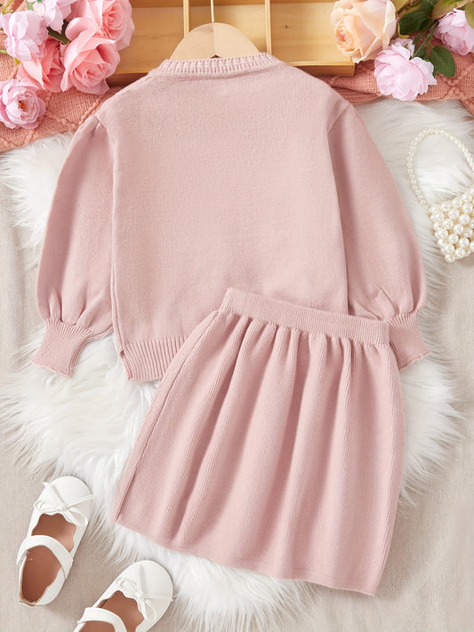 Elegant Long Sleeve Knit Peplum Top and Knee High Skirt Set with Bow Detail for Children – Polyester Sweater Dress Two-Piece Ensemble, Solid Color with Slight Stretch for Winter – Suitable for Ages 3+