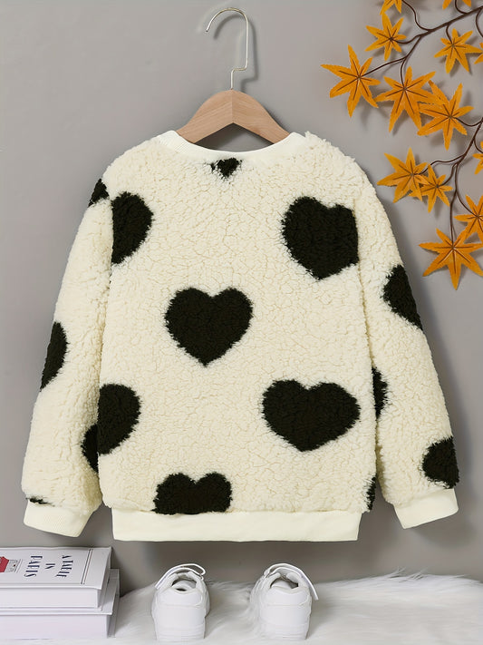 Elegant Crew Neck Fleece Sweatshirt with Heart Pattern, Polyester Knit Fabric with Slight Stretch, Geometric-Pattern Cozy Pullover