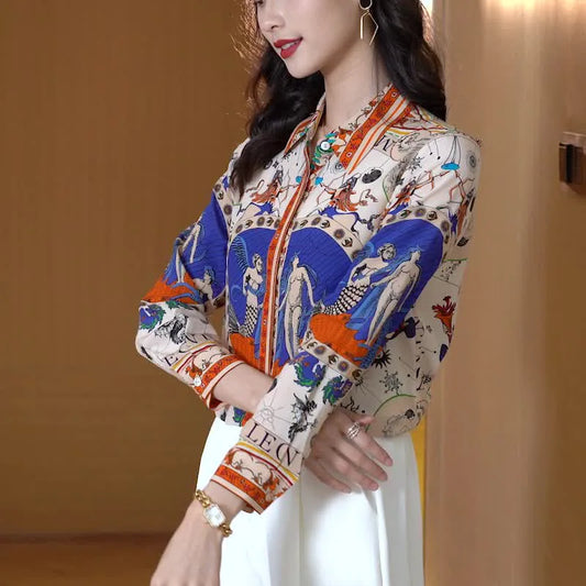 Women's Baroque Printed Mulberry Silk Shirts Spring Classic Vintage Fashion Loose Blouse Female Top Temperament Elegant Shirt
