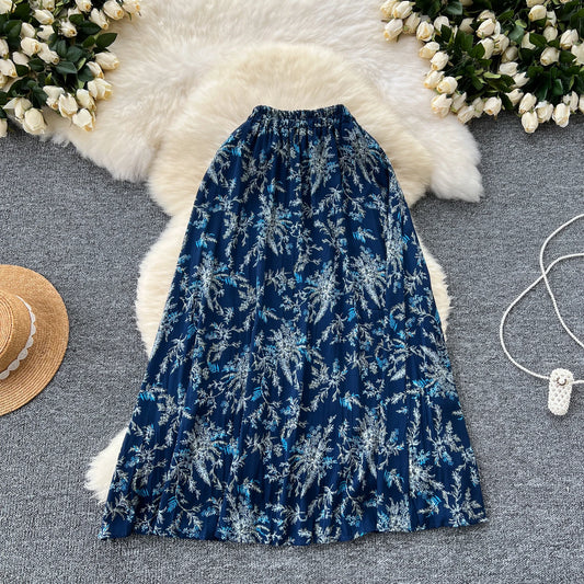 Women Chic print chiffon basics Elegant Elastic Sexy Long dress Waist Fashion Vintage summer Beach A-line Skirt