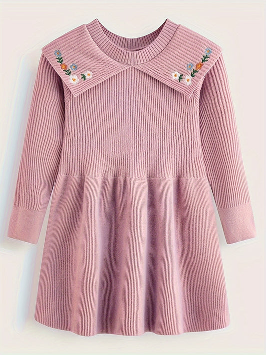 Girls' Embroidered A-line Short Sweater Dresses with Knitted Flower Pattern Lapel Collar for Fall Winter