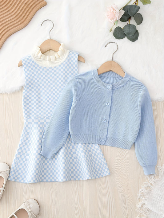 2025 Girls’ Knitwear Set – Long Sleeve Cardigan & Checkered Ruffle Trim Dress