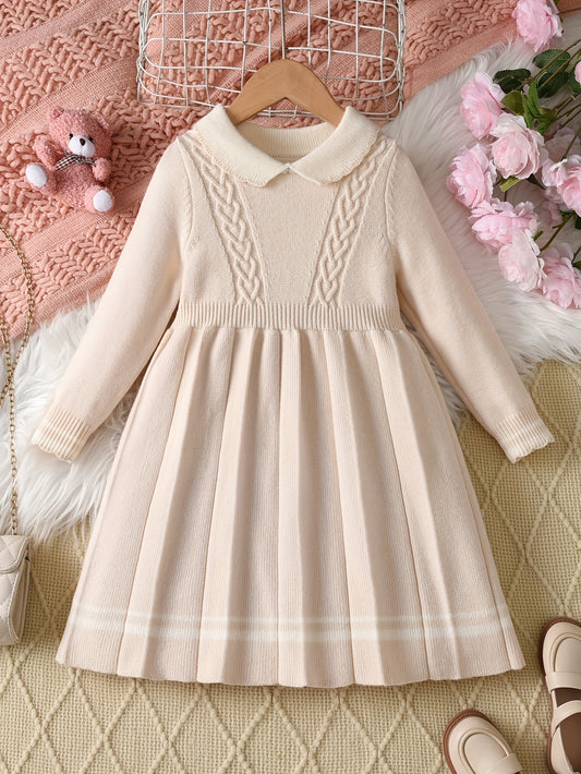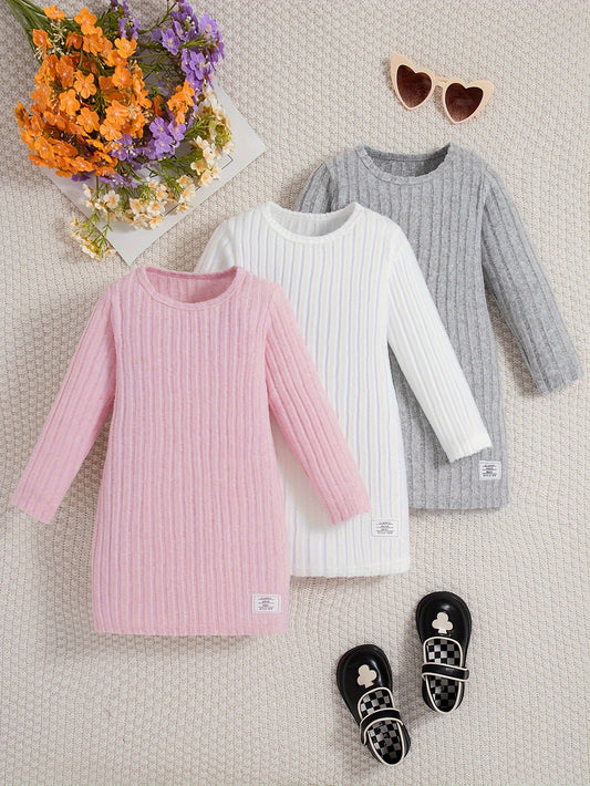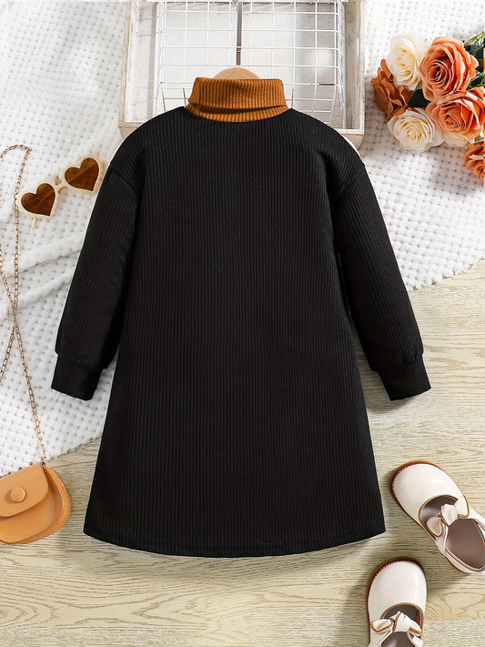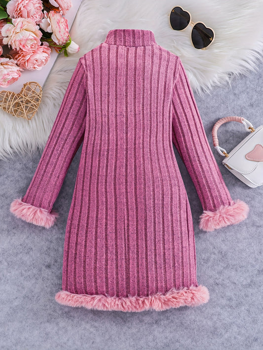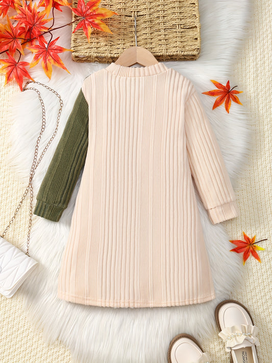 Chic Ribbed Fleece Long Sleeve Dress for Girls - Elegant Spliced Knitted Fashion for Fall & Winter - Soft, Cozy, and Stylish Clothing for Little Ladies