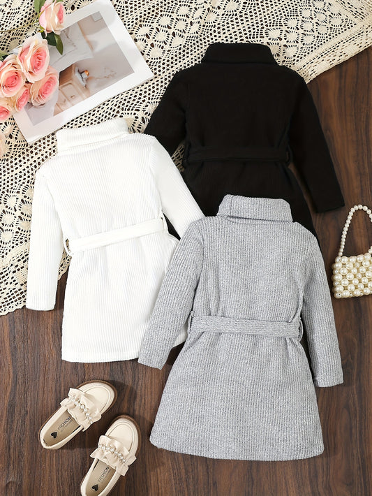 3pcs Girls' Knit Dress Set with Turtleneck & Belt – Soft, Stretchy, Versatile Casual Wear