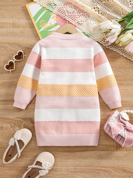 Chic Striped Knit Dress for Girls - Cozy & Casual with Collar, Perfect for Fall/Winter