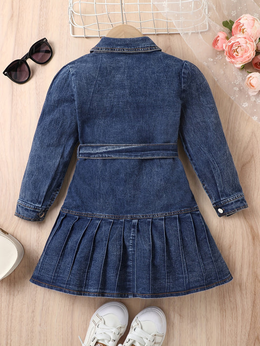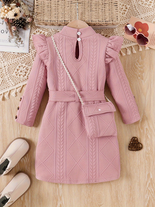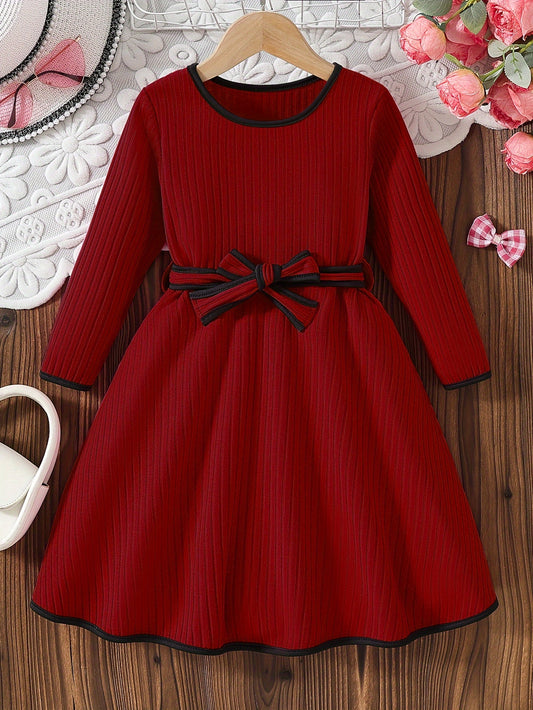 Charming Bow Waist Long-Sleeve Dress for Girls - Elegant Casual Wear for Spring & Fall, Party, Holiday, and Gift-Giving - Soft, Comfortable, and Stylish