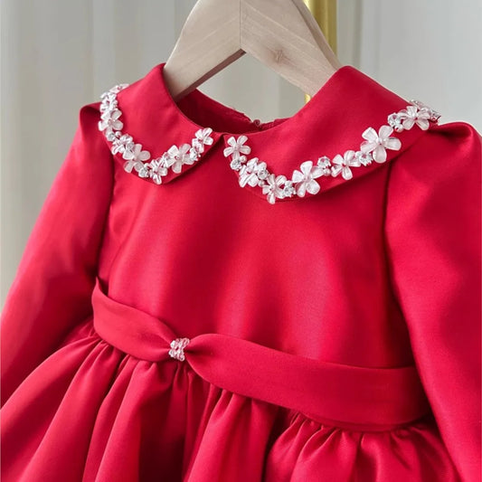 Red Long-Sleeved Satin Princess Dress for Girls – Birthday & Wedding Formal