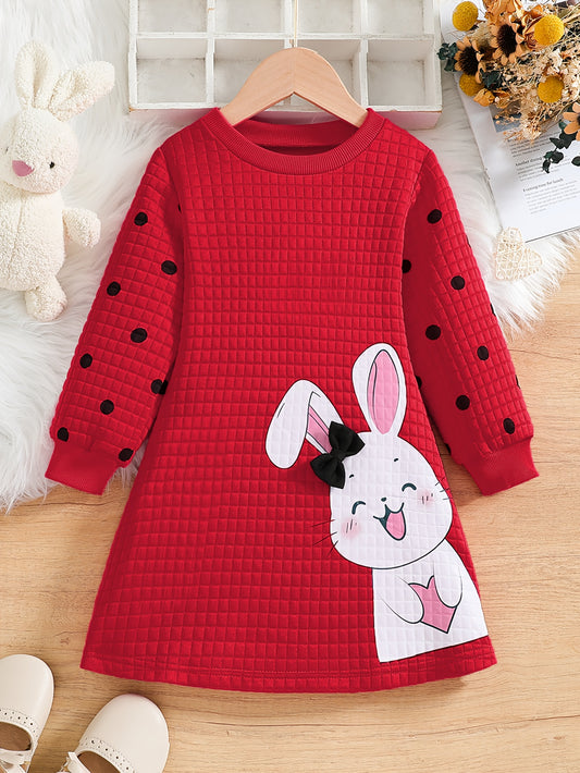 Adorable Bunny Print Long Sleeve Dress for Girls – Cozy Knit with 3D Bow for Fall/Winter